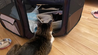 昼寝中の子猫さんと遊びたくて子猫ハウスの出入り口で待ち構えるパイセン達。