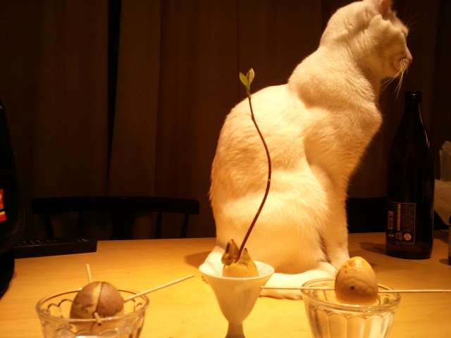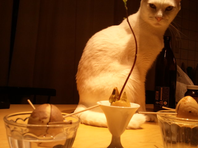 アボカドの種を水に漬けておいたら、根が生えてきて芽が伸びてきたお。