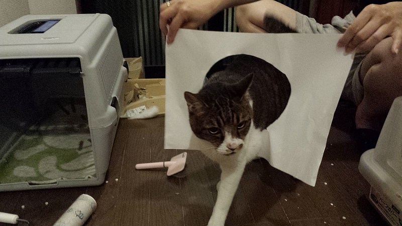 実は輪くぐりの練習ではなくて、猫トイレを収納する家具の穴をどのくらいにすべきかの実験中なのでした。